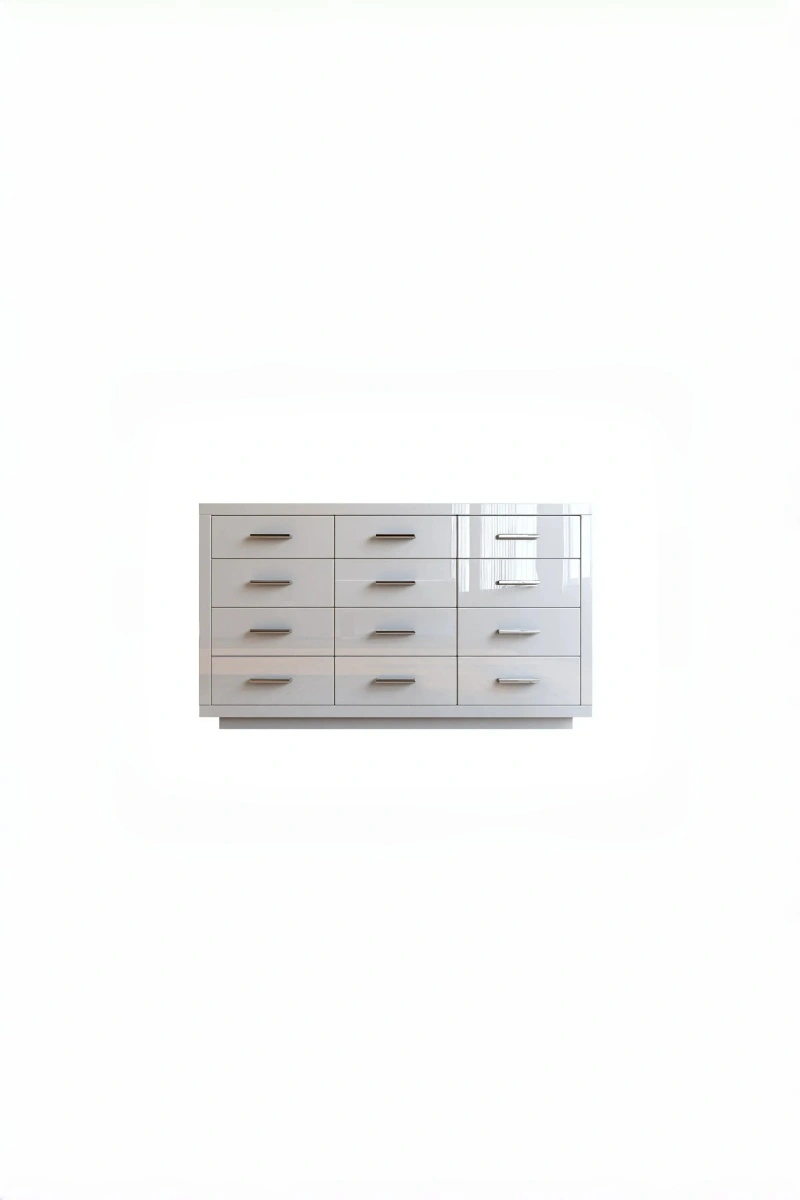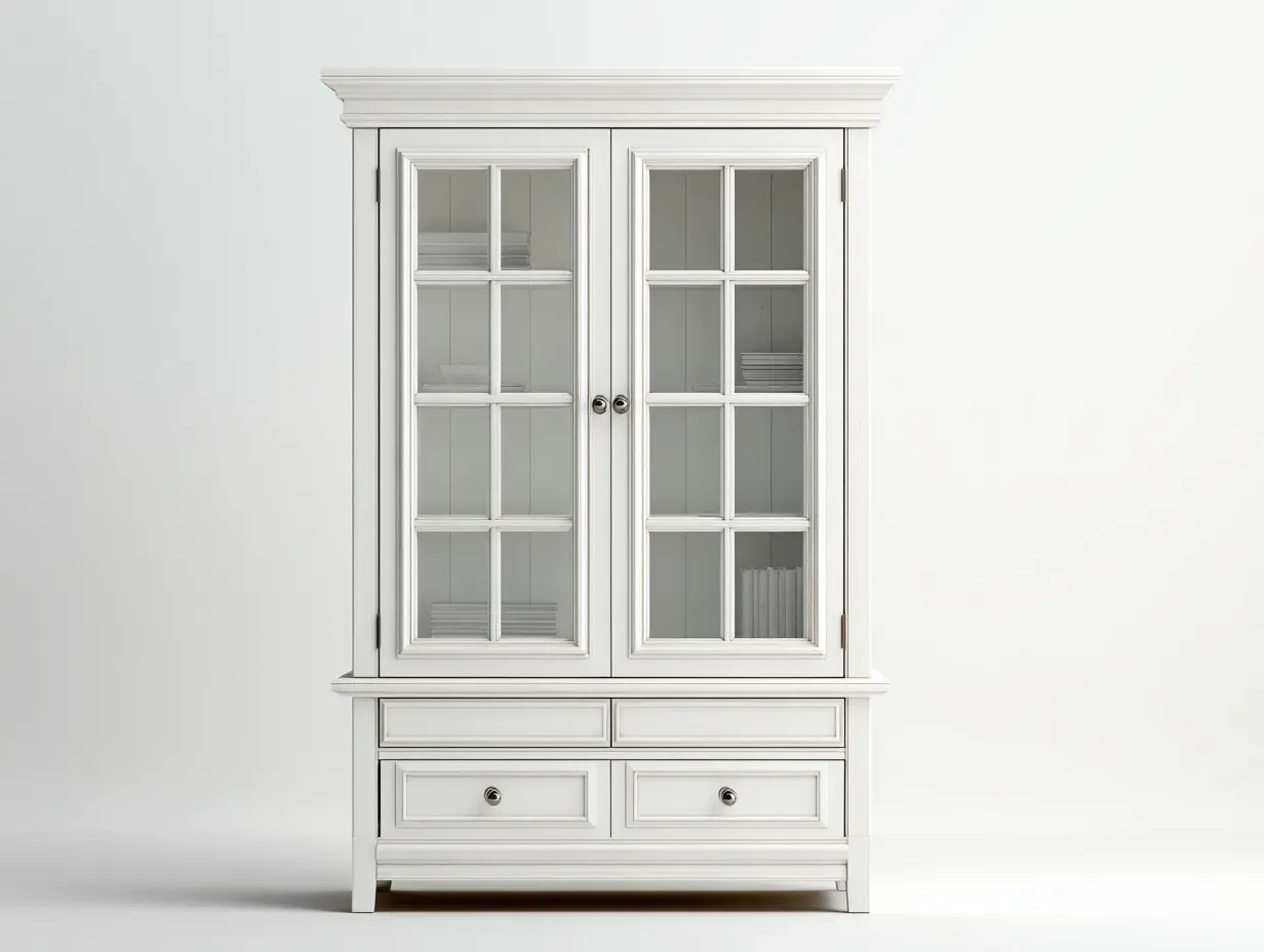 Struttura realizzata in legno con superfici in vetro trasparente. La finitura bianca uniforme valorizza le linee classiche e conferisce un aspetto luminoso e pulito.