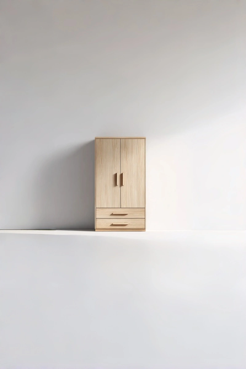 Le ante in vetro permettono una visione chiara del contenuto. I cassetti inferiori offrono spazio chiuso per la conservazione di oggetti, contribuendo a mantenere l'ambiente ordinato.